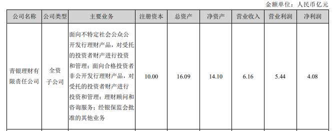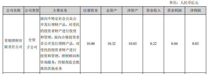 據年報披露的子公司青銀理財的經營數據,截至2021年末,青銀理財理財規模達1678.04億元,管理資產規模1817.45億元。收入方面,2021年青銀理財實現營收6.16億元,淨利潤4.08億元,與2020年末相比,分別增長27倍和135倍。