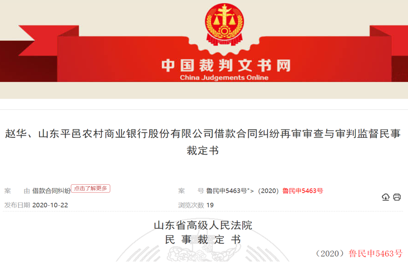 近日,《裁判文書網》公佈了一份山東省高級人民法院出具的《民事裁定書》【(2020)魯民申5463號】,案涉山東平邑農村商業銀行股份有限公司(以下簡稱“平邑農商行”)與自然人劉某、趙某的借款糾紛。