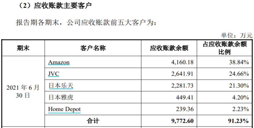 另據招股書披露,截止到2021上半年末華寶新能的應收賬款第一大客户為亞馬遜,並且公司在2020年末對亞馬遜的應收賬款餘額還僅為886.92萬元,也即公司對亞馬遜的應收賬款餘額在2021上半年至少新增了三千萬元以上。這一增幅顯著高於華寶新能同期通過第三方電商平台銷售產品的收入增幅。