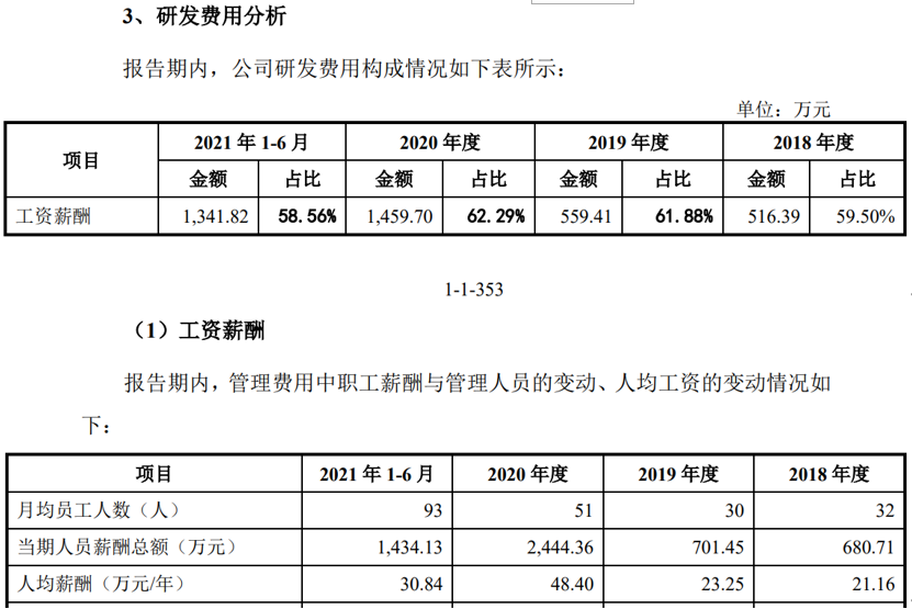與此相比,招股書披露的管理費用構成中,管理崗位人員人均薪酬在2021上半年折算年薪為31萬元,僅相當於2020年度的60%;儘管如此,管理崗位人員人均薪酬還是幾乎相當於研發崗位人員的兩倍。