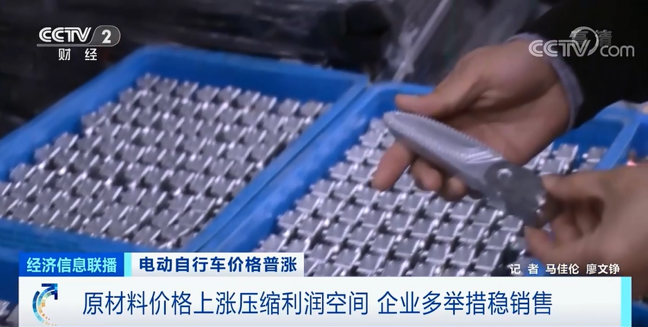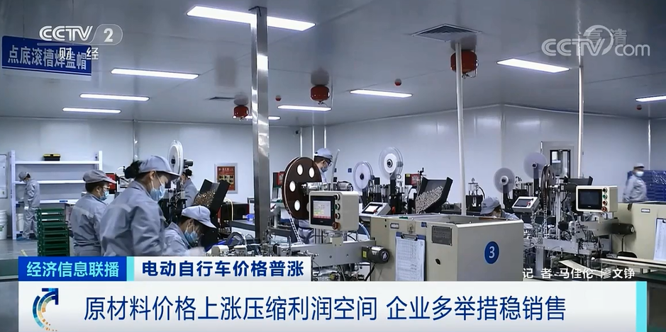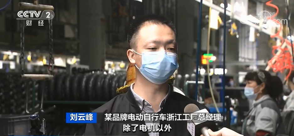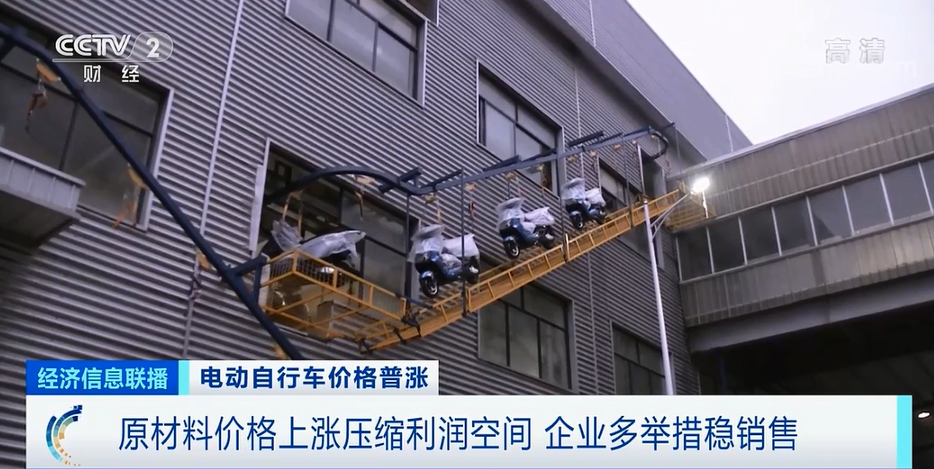 *某品牌電動自行車浙江工廠總經理 劉雲峯:*這種金屬價格漲幅帶來成本增加,一個電機價格增加了20%-30%。除了電機以外,鋰電池用到的鋰,還有外觀件用到的化工原料都在不同程度地漲價。