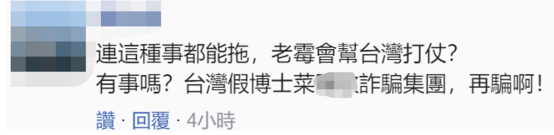 也有網友斥責,“連這種事都能拖,美國會幫台灣打仗?台灣假博士蔡英文詐騙集團,再騙啊!”↓