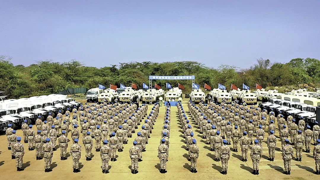 我第8批赴南蘇丹(朱巴)維和步兵營官兵在營區廣場莊嚴肅立。孫雪松 攝