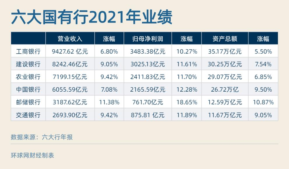 營收和歸母淨利潤方面,工商銀行依舊領先,實現營收9427.62億元,歸母淨利潤3483.38億元。建設銀行緊隨其後,實現營收8242.46億元,歸母淨利潤3025.13億元。其次是農業銀行,實現營收7199.15億元,歸母淨利潤2411.83億元。從漲幅來看,2021年六大行歸母淨利潤較上年增長均超10%,郵儲銀行實現歸母淨利潤761.70億元,同比增長18.65%,漲幅最大。