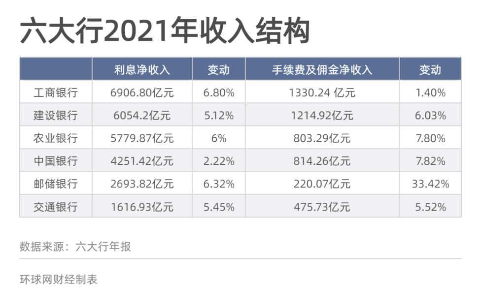 從收入結構來看,利息淨收入仍是主要營收來源。儘管淨息差整體呈現下滑趨勢,六大行利息淨收入增幅保持在2%到7%之間。其中,工商銀行淨利息收入最高,增速最快,分別為6906.8億元,6.8%。郵儲銀行淨利息收入增速僅次於工商銀行,同比增長6.32%,實現淨利息收入2693.82億元。