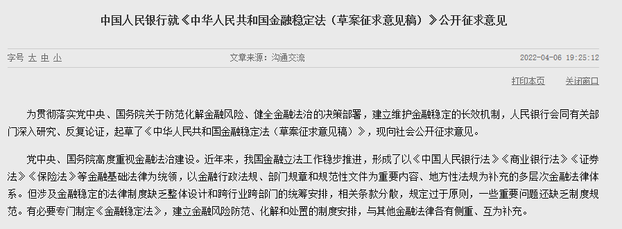 【環球網財經訊】4月6日晚,人民銀行就《金融穩定法》草案徵求意見稿向社會公開徵求意見。