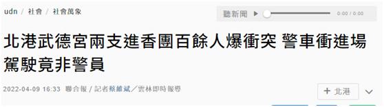 【環球網報道】據台灣《聯合報》報道,台灣雲林縣北港鎮武德宮前廣場今日(9日)爆發衝突,下午有兩支來自不同縣市的宮廟進香團約近200人在廟前“打成一片”,丟擲棍棒叫罵,場面混亂,警方趕到現場後以人牆將兩方隔開,但因進香團人數眾多,仍爆發零星衝突,後來一輛警車衝進現場,才鎮住全場,但下車的人竟然不是警察,“全場傻眼”。