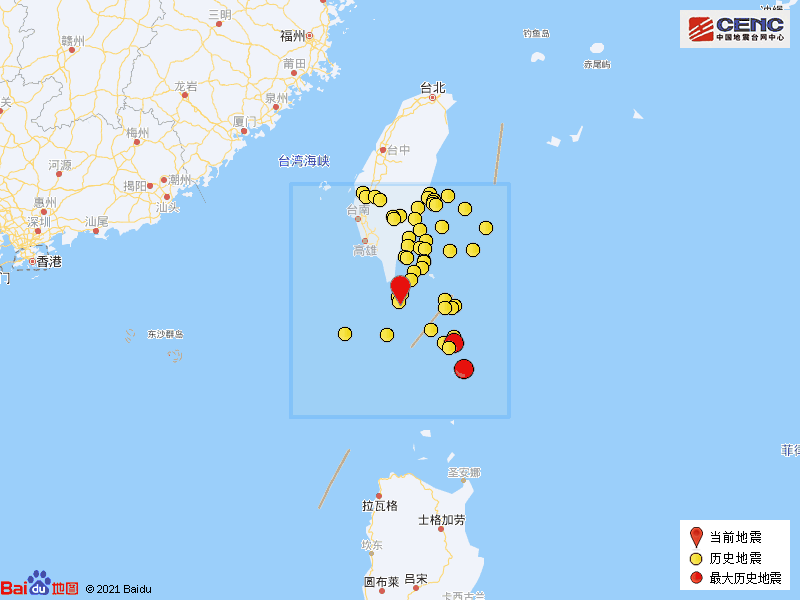 歷史地震: 根據中國地震台網速報目錄,震中周邊200公里內近5年來發生4級以上地震共87次,最大地震分別是2020年4月11日在菲律賓羣島地區發生的5.9級地震(距離本次震中187公里)和2019年7月27日在巴坦羣島海域發生的5.9級地震(距離本次震中137公里),按震級大小前50次歷史地震分佈如圖。