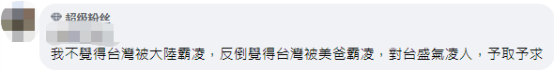 而針對利帕夫斯基“台灣被大陸欺負”的説法,有島內網友並不認同,在臉書留言表示,“我不覺得台灣被大陸霸凌,反倒覺得台灣被美爸霸凌,對台盛氣凌人,予取予求。”