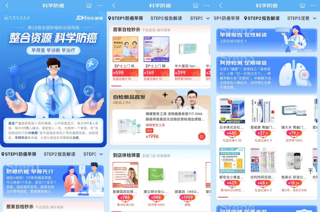 2022年4月15日至21日是第28個全國腫瘤防治宣傳週,今年的主題是“癌症防治早早行動”,旨在提高公眾防癌抗癌意識,通過早預防、早發現、早診斷、早治療,降低癌症發病率和死亡率。京東健康聯合中國抗癌協會,於4月15日推出“科學防癌”會場,用户可在京東APP搜索“癌症早篩”直達專區,瀏覽防癌資訊、購買自檢產品、解讀早篩報告,獲得全方位的篩查服務和覆蓋全週期的科學防癌體驗。