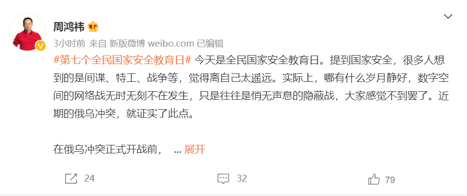 “沒有和平的年代,只有和平的國家。堅定的貫徹落實總體國家安全觀,是我作為一名在網絡安全行業奮戰十餘年的老兵的使命擔當。”4月15日,在第七個全民國家安全教育日這天,三六零(601360.SH,如下簡稱“360“)創始人周鴻禕通過微博發文。他表示,“提到國家安全時,很多人想到的是間諜、特工、戰爭等,覺得離自己太遙遠。但實際上,沒有什麼歲月靜好,數字空間的網絡戰無時無刻不在發生,只是往往是悄無聲息的隱蔽戰,大家感覺不到罷了。”