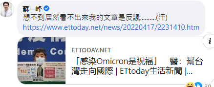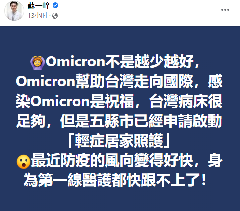 蘇一峯16日在臉書説,奧密克戎不是越少越好,奧密克戎幫助台灣走向國際,感染奧密克戎是祝福,台灣病牀很足夠,但是5個縣市已經申請啓動“輕症居家照護”,“最近防疫的風向變得好快,身為第一線醫護都快跟不上了!”