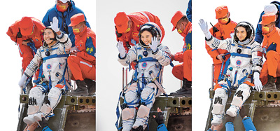 4月16日,神舟十三號載人飛船返回艙在東風着陸場成功着陸。這是航天員翟志剛、王亞平、葉光富(左至右)安全順利出艙。