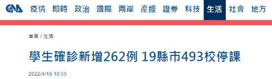 台媒:台灣新增262例學生確診新冠肺炎病例,全台493所學校停課