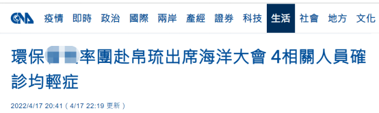 【環球網綜合報道 記者 趙友平】據台灣“中央社”消息,台外事部門17日晚發佈新聞稿稱,由“環境保護署長”張子敬任“特使”,率團出訪帕勞並出席第7屆“我們的海洋大會”,代表團成員17日返回台灣,經核酸篩檢,共有2名團員及1名與會人員確診新冠,台灣駐帕勞機構也有1名人員確診,目前均屬輕症。