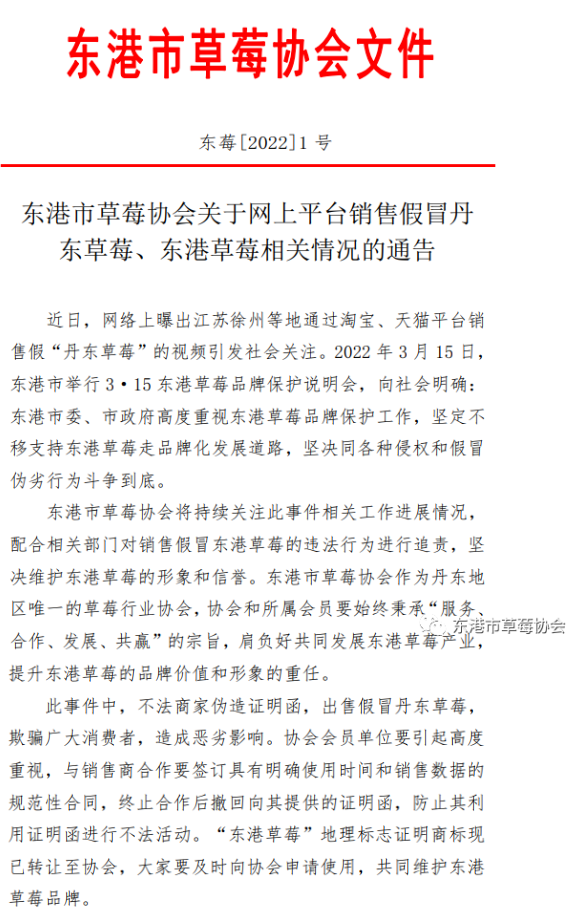3月17日,東港市草莓協會公開發布“關於網上平台銷售假冒丹東草莓、東港草莓相關情況的通告”,並稱“此事件中,不法商家偽造證明函,出售假冒丹東草莓,欺騙廣大消費者,造成惡劣影響。協會會員單位要引起高度重視,與銷售商合作要簽訂具有明確使用時間和銷售數據的規範性合同,終止合作後撤迴向其提供的證明函,防止其利用證明函進行不法活動。‘東港草莓’地理標誌證明商標現已轉讓至協會,大家要及時向協會申請使用,共同維護東港草莓品牌。”