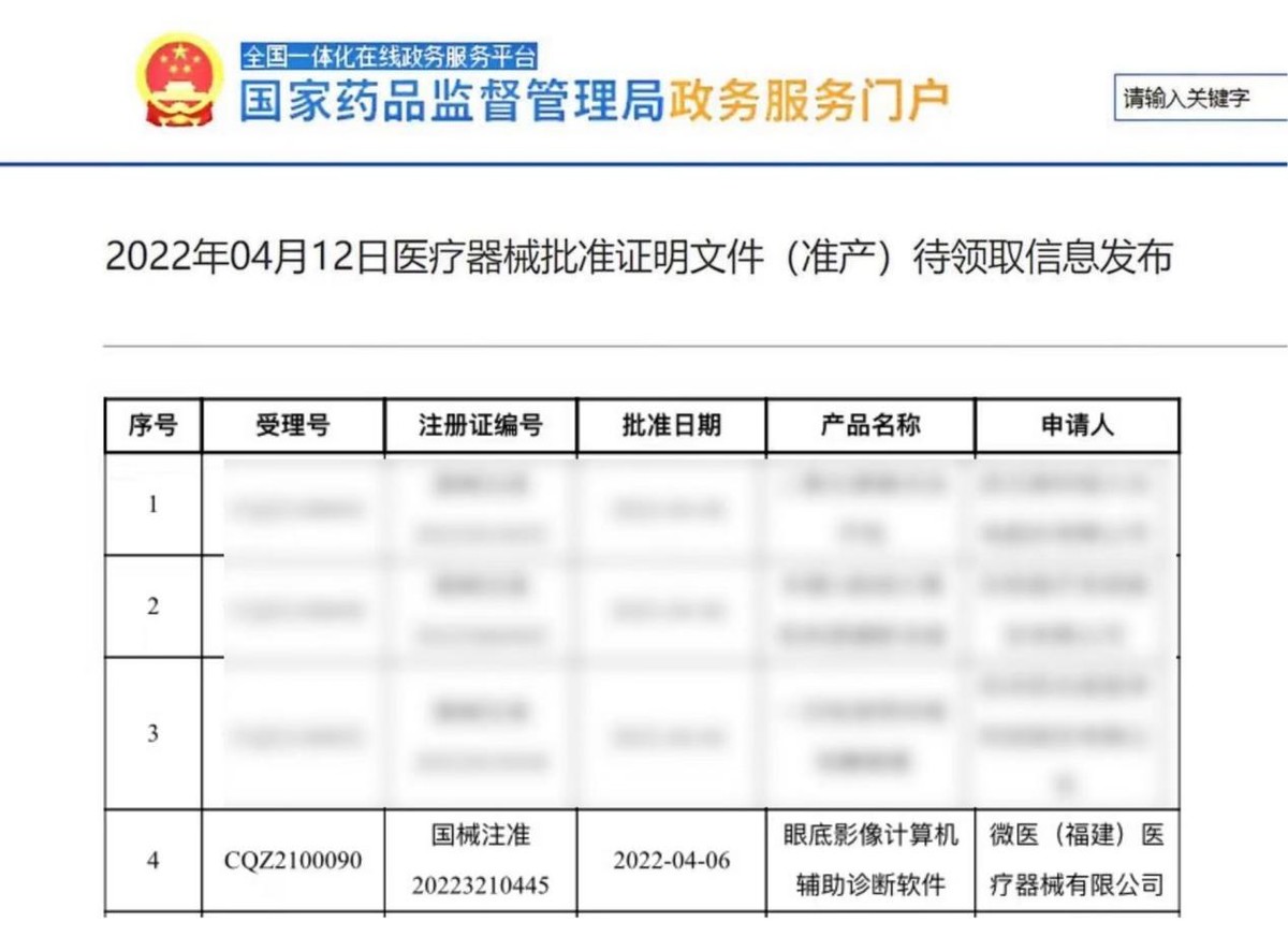 4月13日,國家藥品監督管理局發佈新一批醫療器械準產獲批名單,微醫“眼底影像計算機輔助診斷軟件”名列其中,成為繼硅基智能、鷹瞳科技等企業的糖尿病性視網膜病變產品之後,又一款在國內準產上市的眼科AI輔助診斷系統。