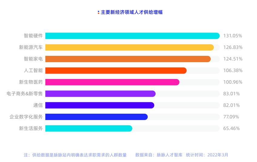 根據脈脈日前發佈的《乘勢而上人才流動與遷徙2022》報告(以下簡稱《報告》)中指出,主要的新經濟領域人才供給均明顯上漲,而漲幅較高的行業分別為智能硬件、新能源汽車、智能家電、人工智能及新生物醫藥。從行業流動趨勢來看,IT互聯網為各個風口行業持續輸送人才,切換賽道的IT互聯網人首選是人工智能行業,其次是企業級軟件、電子商務等。新能源產業的主要人才來源是IT互聯網和製造業。