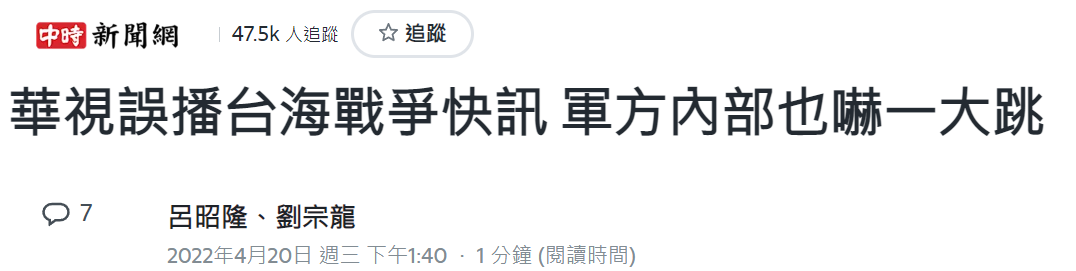 中時新聞網稱,華視早上播快訊,出現“新北市遭共軍導彈擊中,台北港艦艇爆炸、設施、船舶損毀”、“戰爭有爆發之虞”、“中共備戰頻繁,‘總統’發佈緊急命令”等字樣,民眾一片譁然,台軍方內部聽到消息後,也嚇了一大跳。一位官員説,他直覺就是搞錯了,怎麼可能大陸打導彈,“‘國防部’都不知道,電視台卻能先掌握”。