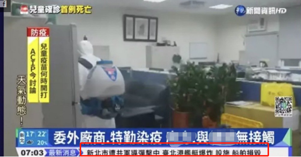 【環球網報道】據台灣《聯合報》20日消息,台灣“華視新聞”電視台(簡稱:“華視”)今早的節目畫面上出現“新北市遭共軍導彈擊中,台北港艦艇爆炸、設施、船舶損毀”等快訊字樣,引起島內民眾恐慌。“華視”稍後回應稱是錯誤植入,台軍方也澄清稱“台海一切正常”。對此,有島內網友調侃,“已經知道會怎麼被修理,預錄好了?”