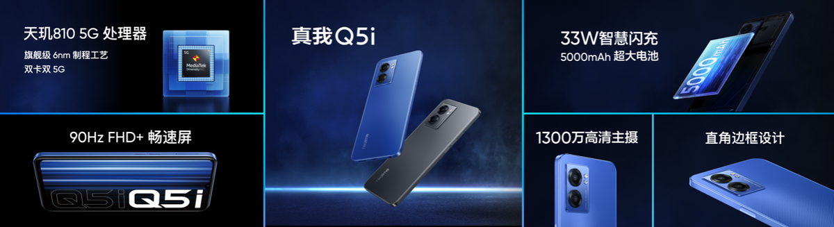 此次發佈會上,realme還發布了真我Q5i,在配置上繼續領先同價位段。真我Q5i搭載了33W智慧閃充+5000mAh超大電池的閃充越級配置,採用直角邊框設計,同時配合90Hz高清暢速屏、天璣810 5G處理器。
