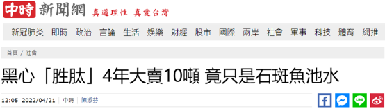 據台灣“中央社”報道 ,台“法務部調查局”台中市調查處21日發佈新聞稿説,台中市某生技公司負責人郭姓男子,自2017年起,大量購買石斑魚在位於南投縣的養殖場中飼養,再將養殖石斑魚的池水直接過濾後裝瓶販賣,命名為“海洋活性小分子肽”。