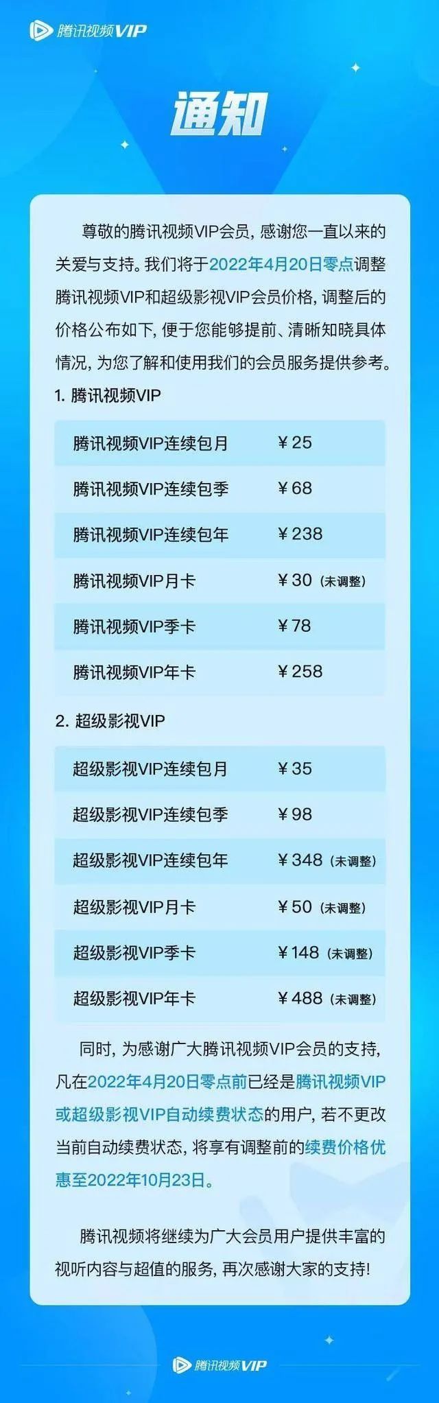 4月9日,騰訊視頻宣佈,將於2022年4月20日零點調整騰訊視頻VIP和超級影視VIP會員價格。凡在2022年4 月20日零點前已經是騰訊視頻VIP或超級影視VIP自動續費狀態的用户,若不更改當前自動續費狀態,將享有調整前的續費價格優惠至 2022年10月23日。