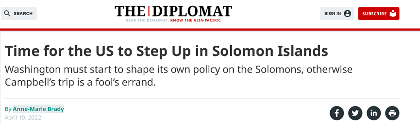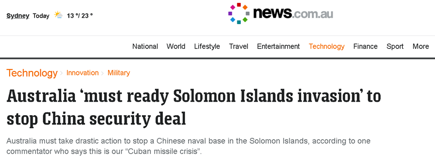 “外交學者”網站的創始人、並給澳大利亞多家媒體擔任寫手的澳大利亞媒體人DavidLlewellyn-Smith,更是在上月的一篇文章中赤裸裸地讓澳大利亞做好“入侵所羅門羣島”的準備,以阻止中所的安全合作。