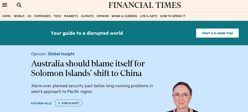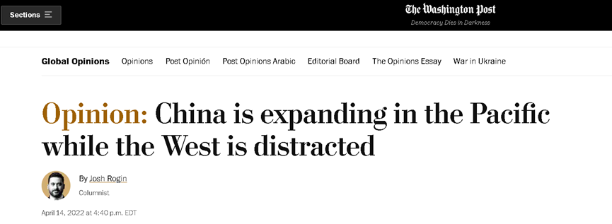 曾經瘋狂造謠新冠病毒來自武漢病毒所的美國《華盛頓郵報》的冷戰派專欄作家JoshRogin,則在中所合作協議簽署前的4月14日就已經為美國干涉所羅門羣島的主權政策做起了“輿論鋪墊”,稱“如果華盛頓不盡快意識到這個威脅,中國就將在支配南太平洋地區上取得危險和難以逆轉的勢頭”。