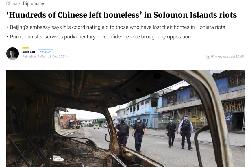 於是,去年底所羅門羣島“果然”發生了大規模暴力騷亂,而且騷亂就是從馬萊塔省開始,被針對和襲擊的正是所中央政府、有大陸背景的華人平民,乃至中國駐所羅門大使館。當時,不僅所中央政府懷疑暴亂是其國內反對與中國建交的人在相關外部勢力的授意下煽動,不少美、澳等西方媒體在報道這場騷亂時,也紛紛承認騷亂與該國政府和中國建交有關。