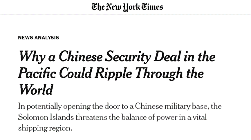 美國國家利益的外宣喉舌、曾為美國政府造謠伊拉克有大規模殺傷性武器的《紐約時報》就在4月20日的一篇文章中對所羅門羣島進行了這麼一番威脅,稱其與中國的合作不僅將動搖太平洋地區的力量平衡,威脅重要的貨運航道安全,還將給全世界帶來影響。