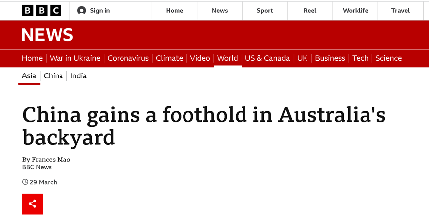 諸如BBC等西方主流媒體,在近期報道所羅門羣島與中國的合作時,更是完全無視所羅門羣島的主權,竟直接將人家的國家稱作了“澳大利亞的後院”,妥妥的霸權主義的嘴臉。