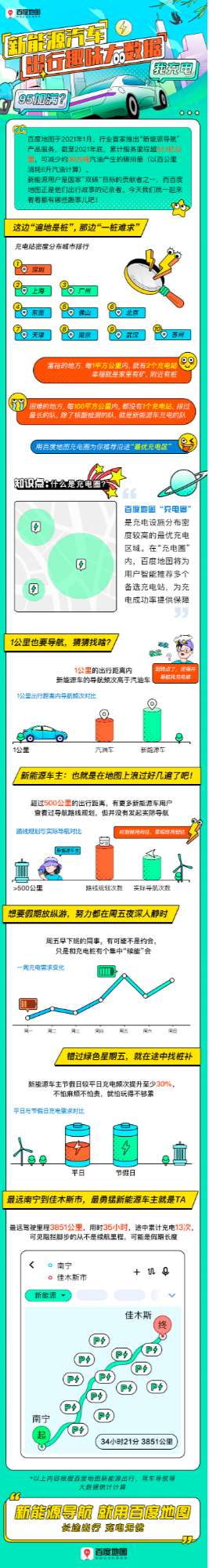 作為新一代人工智能地圖,百度地圖致力於為用户不斷優化出行體驗,目前百度地圖“新能源導航”已進行了多次迭代升級,為新能源車主高效規劃充電路線,進行充電決策。未來,百度地圖也將為新能源車主提供更人性化的細分場景服務,保障出行便捷和智能。