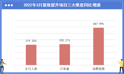 數據顯示,2022年3月,緊緻抗衰需求迎來爆發式增長,從消費規模上看,緊緻提升項目的消費規模同比增長587.99%。與此同時,美白嫩膚需求也穩步上升,光子嫩膚下單量環比增長47.37%,位列3月醫美消費訂單榜的榜首。
