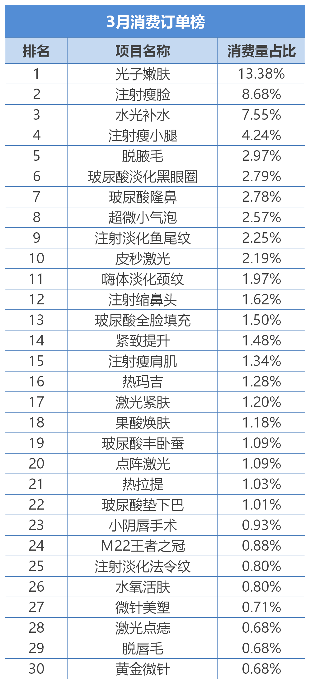 值得注意的是,儘管3月緊緻提升項目的消費規模最大,但從訂單量來看,光子嫩膚的下單量遙遙領先,以13.38%的佔比問鼎3月醫美消費訂單榜,該榜單的TOP5項目還包括注射瘦臉、水光補水、注射瘦小腿、脱腋毛。