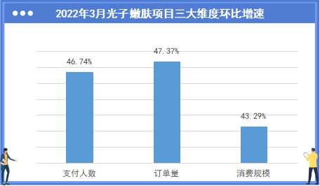 實際上,光子嫩膚因為見效快、痛感小、無需恢復等優勢,具有頗高的復購率,也正是因為這些優點,使得光子嫩膚成為越來越多消費者踏入醫美領域的入門項目。與2022年2月相比,光子嫩膚在3月的支付人數環比增長了46.74%,訂單量環比增長47.37%。