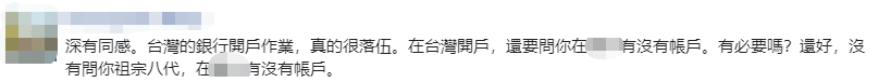 對此,有島內網友在相關報道的評論區留言表示“深有同感”,並稱“台灣的銀行開户作業,真的很落伍。”