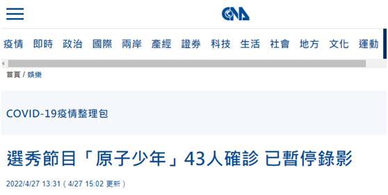 台媒:台灣選秀節目“原子少年”選手、工作人員等43人確診,已暫停錄影