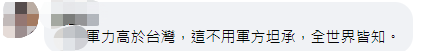 在看到台防務部門的報告內容後,有島內網友在台媒評論區寫道,“大陸軍力高於台灣,這不用軍方坦承,全世界皆知。”也有人質疑,“(台)軍方現在才坦承?”↓
