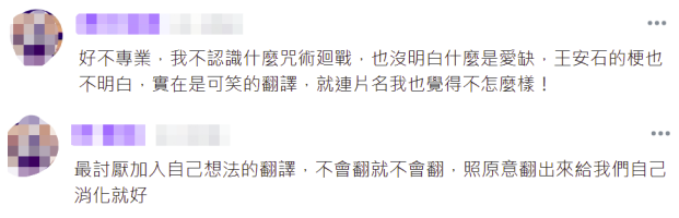 比如,有島內網友稱,片中字幕出現“后里穴(Holy Shit)”、“這一切都是大便版咒術回戰(Because it’s all just a pointless swirling bucket of bullshit.)”、“武媚娘愛缺,奪掌全世界(It’s called unlovable bitches like us make the world go round)”、“你現在是王安石(Just be a rock)”等翻譯,與角色實際説出的對白有明顯落差,語焉不詳的程度簡直像是譯者在“二次創作”,網友痛批翻譯“很爛、不專業”。