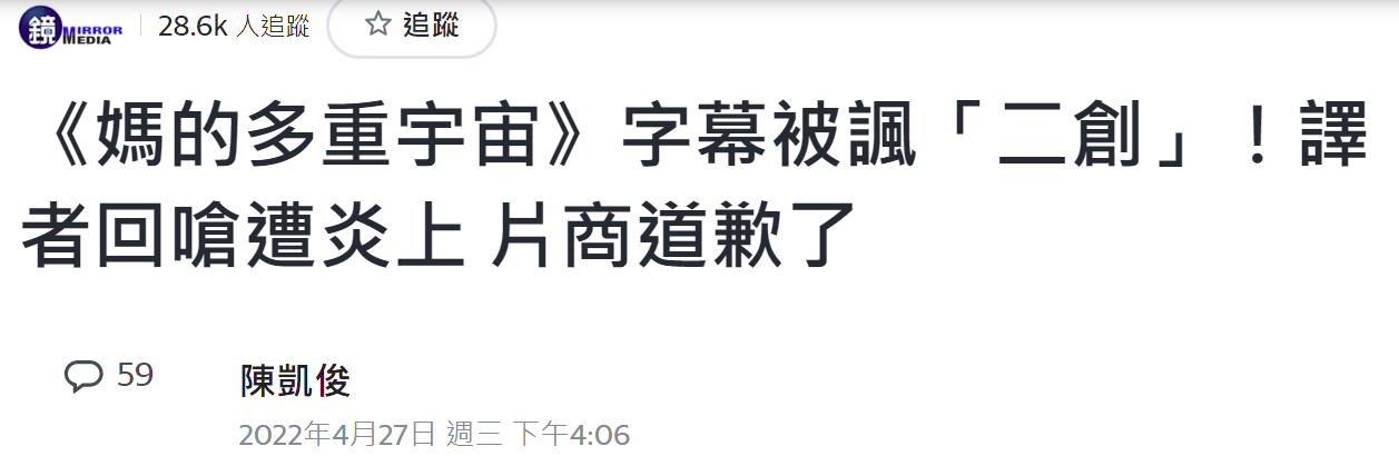報道稱,4月22日,該片又以《媽的多重宇宙》的片名在台灣上映,同樣取得了不錯的評價。片中的中文字幕翻譯卻引發爭議。有網友在島內論壇PTT發文質疑字幕“超譯”問題太嚴重,有些對白已偏離原意,網友甚至諷刺譯者根本是在“二次創作”。