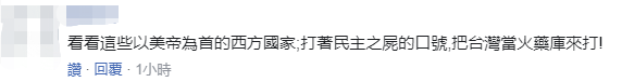還有網友説,“看看這些以美國為首的西方國家,打着民主的口號,把台灣當火藥庫來打!” ↓