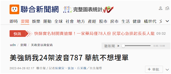 台媒:美國想以80億美元強賣台灣24架波音787,華航不想埋單