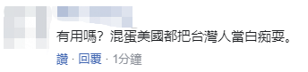 “有用嗎?”針對美眾議院通過這一法案,有島內網友表示,“美國都把台灣人當白痴耍”。↓