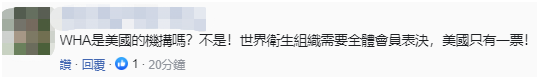 還有網友稱,“2009年台灣就已經是以觀察員身份參加世界衞生大會,2017年被蔡(蔡英文)搞沒,現在美國只是藉此事挑釁大陸而以,一切都是美國霸權利益在考慮。”“WHA是美國的機構嗎?不是!世界衞生組織需要全體會員表決,美國只有一票!”↓