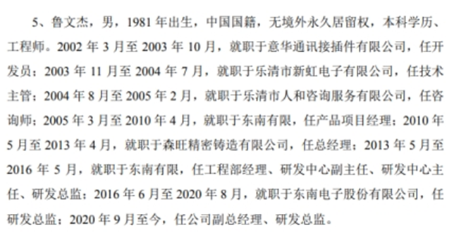 在審核問詢的回覆函中,東南電子僅表示,公司前副總經理林應輝曾在深圳東南任職。2016年6月至2017年5月,林應輝在東南電子任公司副總經理。2018年初,因深圳東南建立生產車間,需要該方面人才,尋求林應輝幫助。林應輝在2018年4月任職於深圳東南,並於2019年5月離職。截至2021年6月,林應輝未持有深圳東南股權。