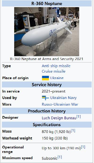 按照維基解密等公開資料的説法,“海王星”導彈的生產廠家包括多家烏克蘭知名軍工綜合體。而查到這裏老劉發現了兩個看起來有點“熟悉”的名字:一個是“阿爾喬姆-盧奇”軍工綜合體,其中就包括了“海王星”反艦導彈的設計單位盧奇設計局,以及俄軍方此次官宣的被空襲的兵工廠“阿爾喬姆”的名稱組合體。