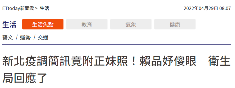 台媒:“新北疫調短信”中鏈接點開竟是美女自拍,當地衞生局稱“網址被篡改”