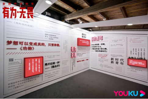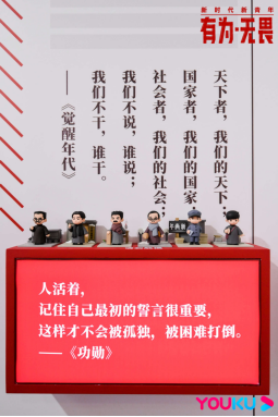在主題展裏,還設有多個沉浸互動體驗:在“無畏電話亭”與有為青年“連線”,聆聽他們的鼓勵;在“正能量台詞牆和視頻牆”,來自優酷的經典正能量影視內容再次重現,激勵、温暖奮鬥着的青年。由優酷聯合出品的電視劇《覺醒年代》的Q版人物手辦也將在現場驚喜亮相。