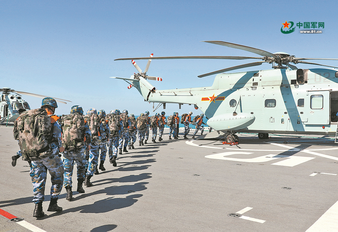 海軍陸戰隊員搭乘海南艦艦載直升機,開展立體投送訓練。